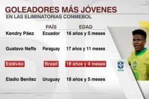 18岁4个月!埃斯特旺是南美世预赛历史第三年轻进球者