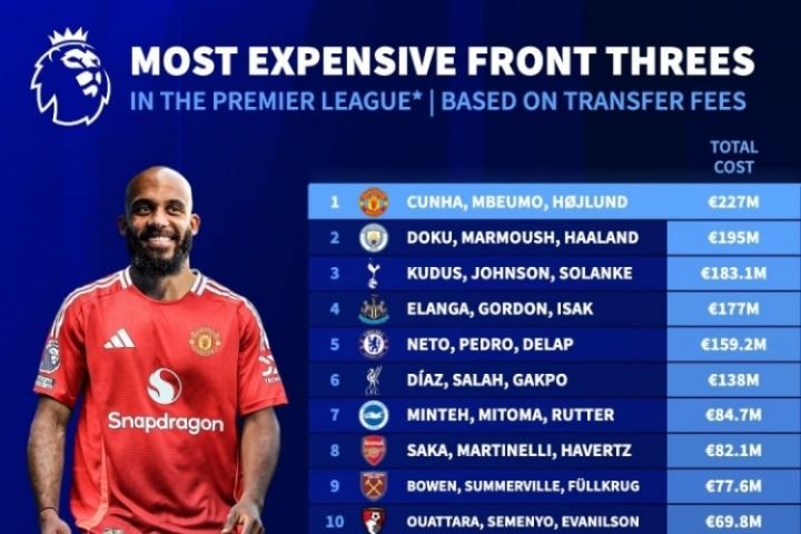 体育资讯07月22日讯 德转今日盘点了英超各队锋线三叉戟的转会费排名,其中曼联以2.27亿欧居首,曼城1.95亿欧第2。